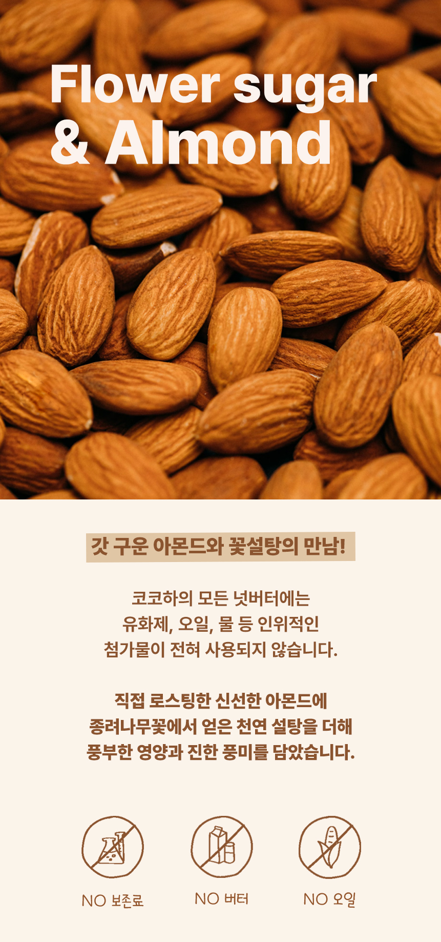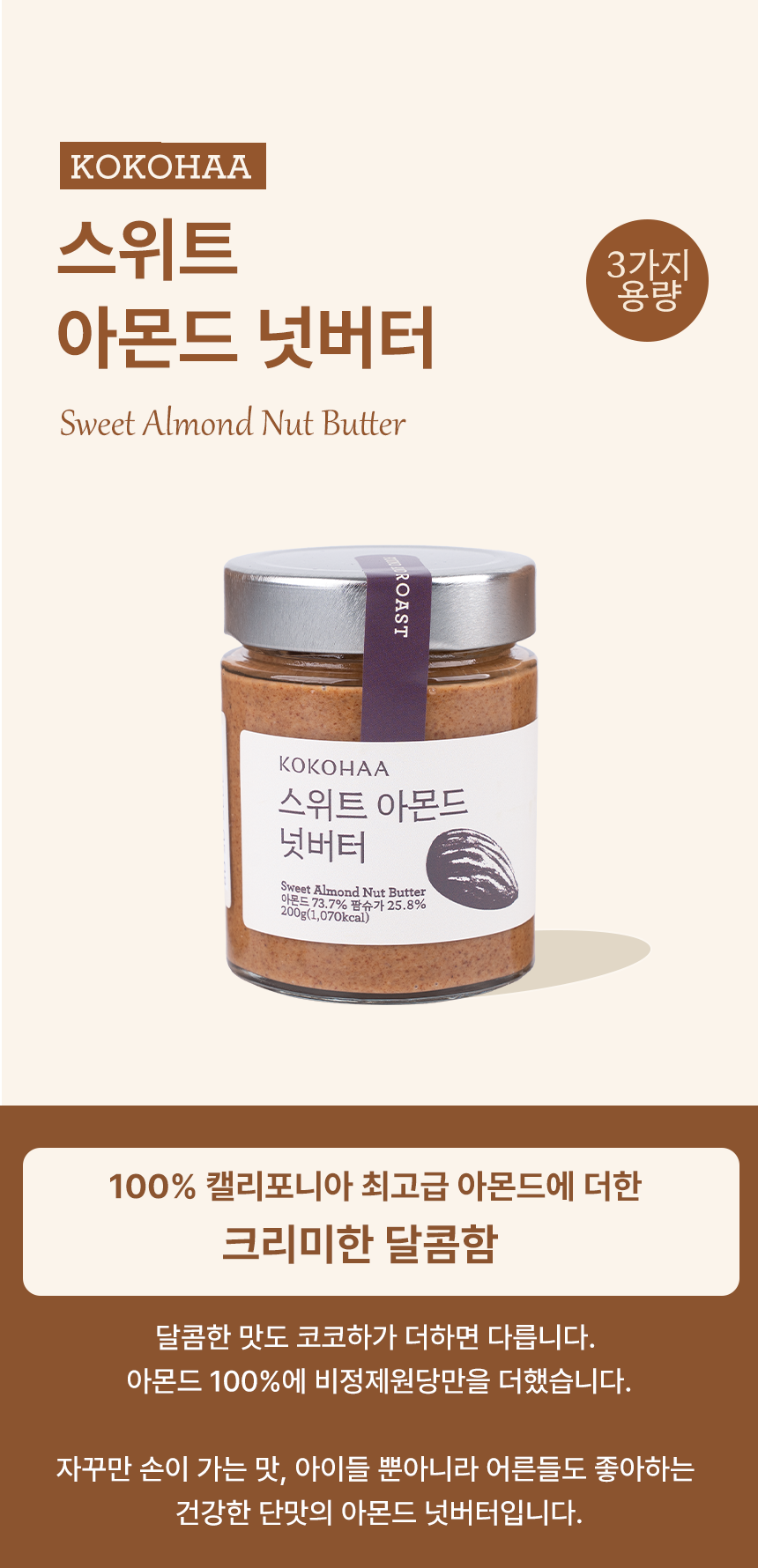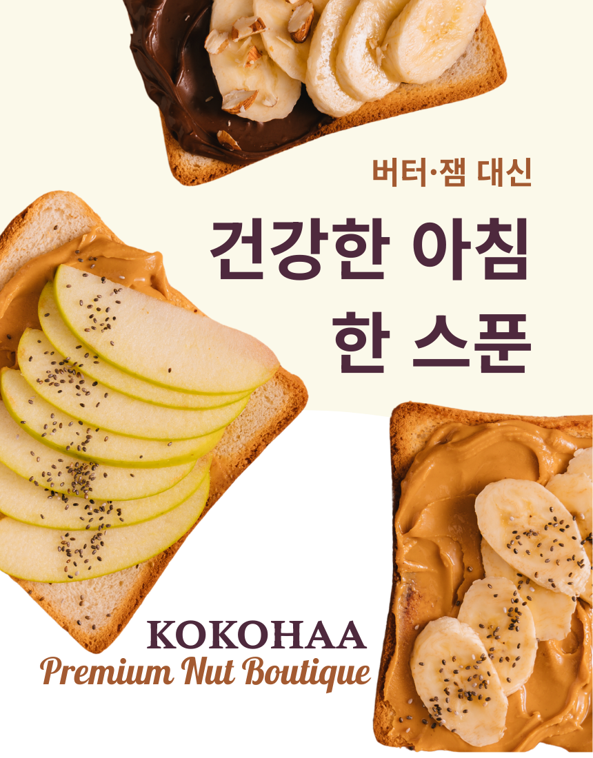 코코하 스위트 아몬드 넛버터입니다. 제주에서 직접 저온 로스팅 공법으로 바로 볶아낸 신선한 아몬드에 종려나무 꽃에서 나온 꽃설탕을 입힌 스위트 아몬드를 통째로 갈아 달콤함과 고소함을 담았습니다.