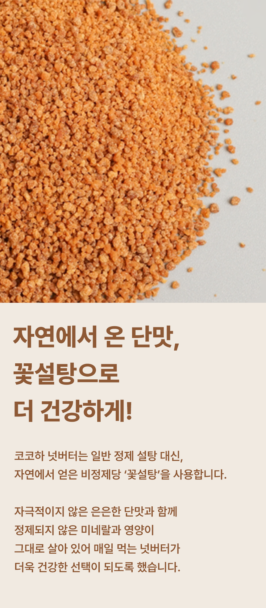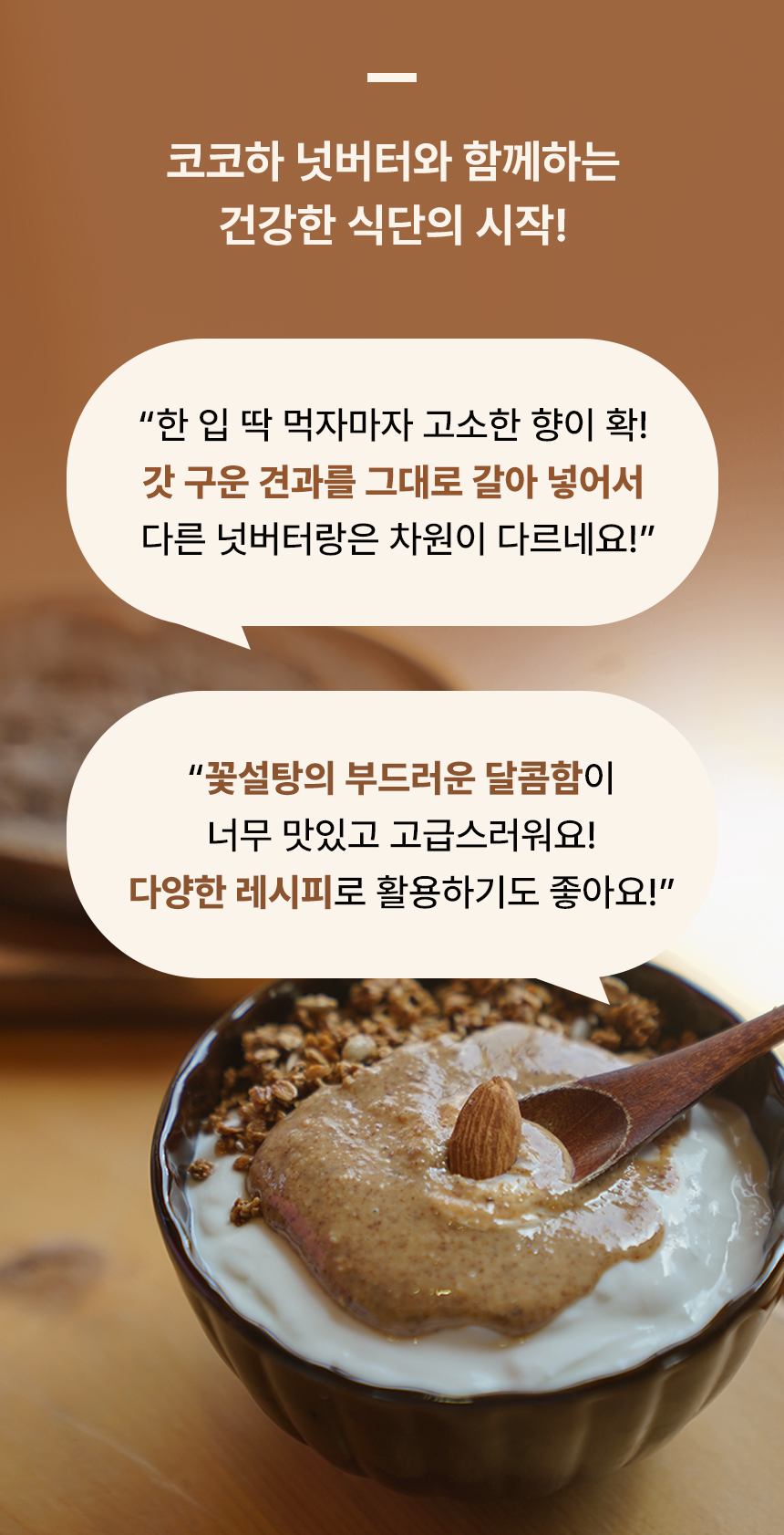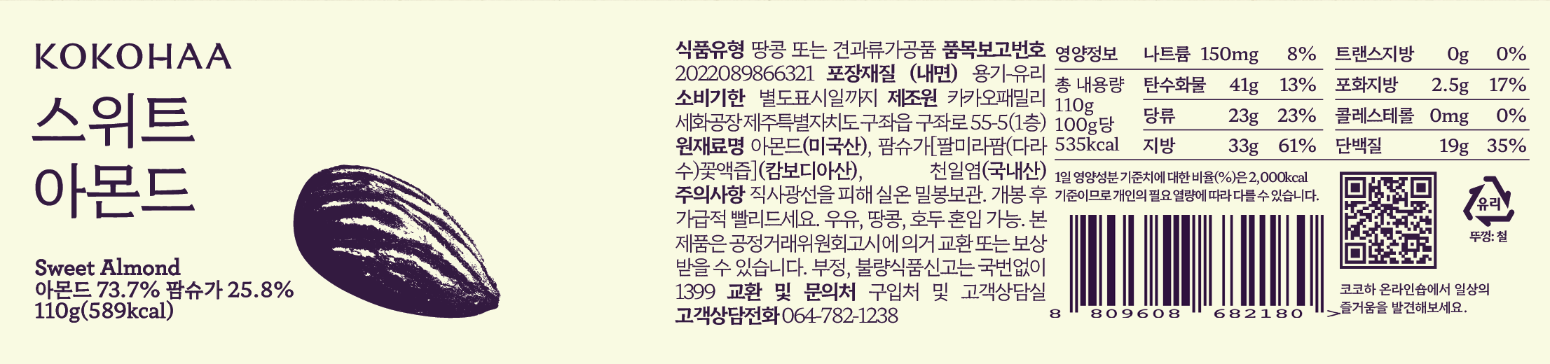 코코하 스위트 아몬드 넛버터입니다. 제주에서 직접 저온 로스팅 공법으로 바로 볶아낸 신선한 아몬드에 종려나무 꽃에서 나온 꽃설탕을 입힌 스위트 아몬드를 통째로 갈아 달콤함과 고소함을 담았습니다.