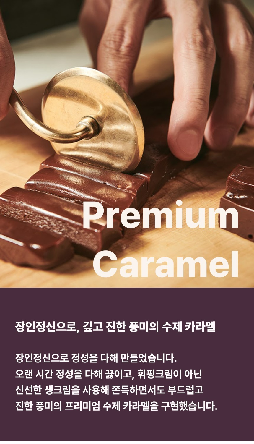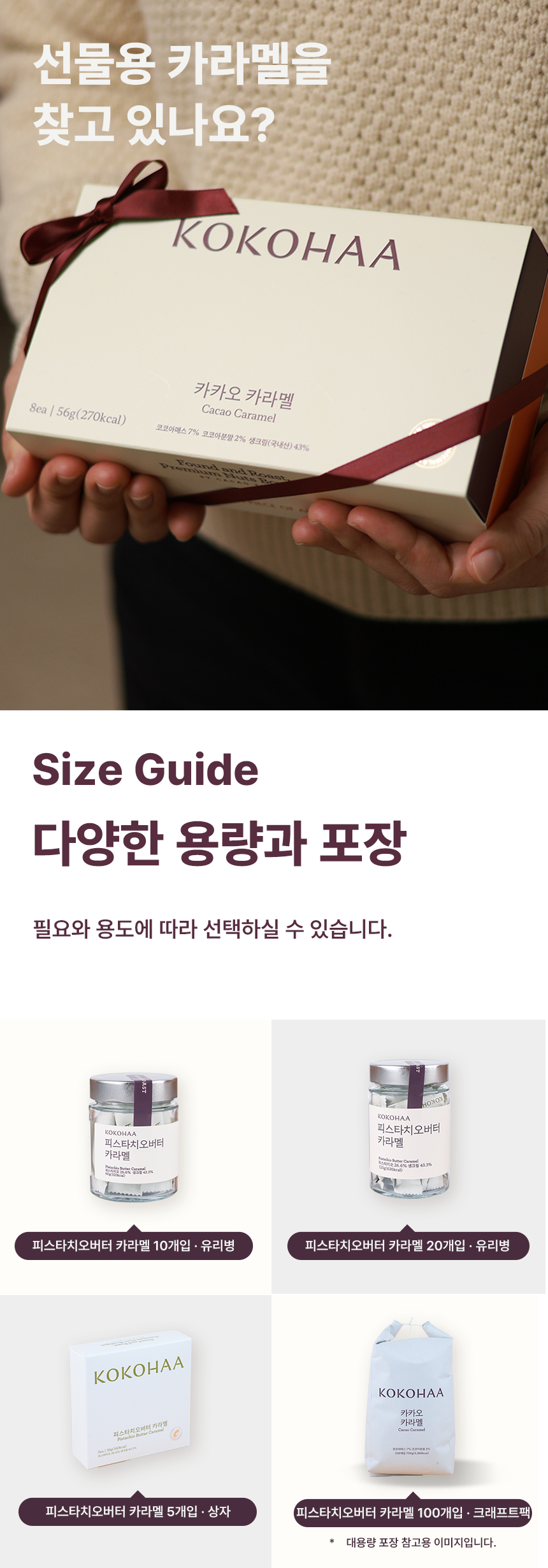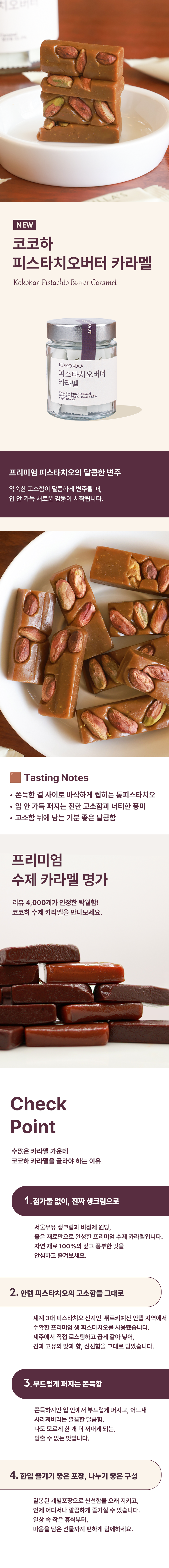 인위적인 첨가물 없이, 신선한 생크림과 모래설탕 등 엄선된 재료만을 사용한 무첨가 카라멜로, 갓 구운 피스타치오가 그대로 박혀 있어 한층 더 고소하고 깊은 맛을 자랑합니다.