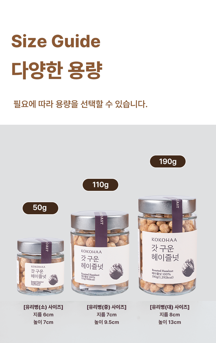 용량 옵션 50g 유리병(소), 110g 유리병(중), 190g 유리병(대)