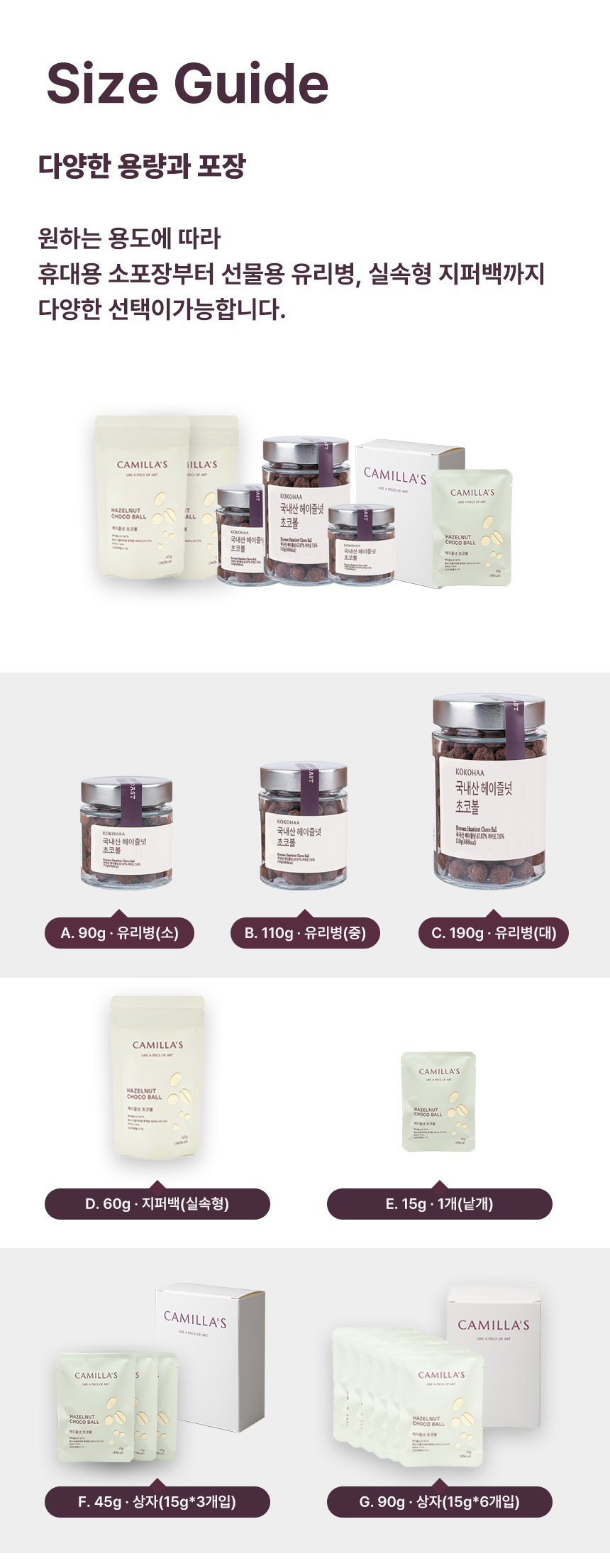 용량 옵션 15g, 45g(15gx3개입 박스포장), 50g(유리병소), 60g(지퍼백), 90g (15gX6개입 박스포장), 110g(유리병중), 190g(유리병대)