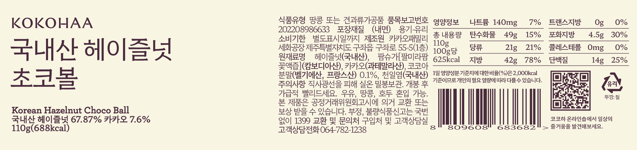 코코하 국내산 헤이즐넛 초코볼은 자연이 빚어낸 고급 재료만으로 완성했습니다.