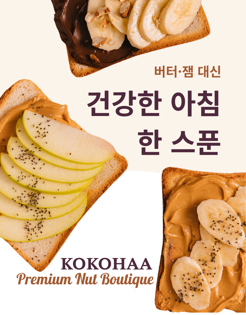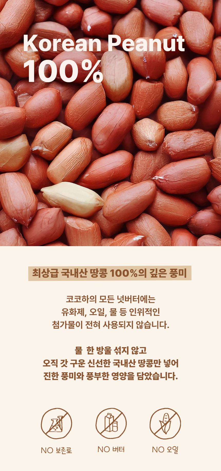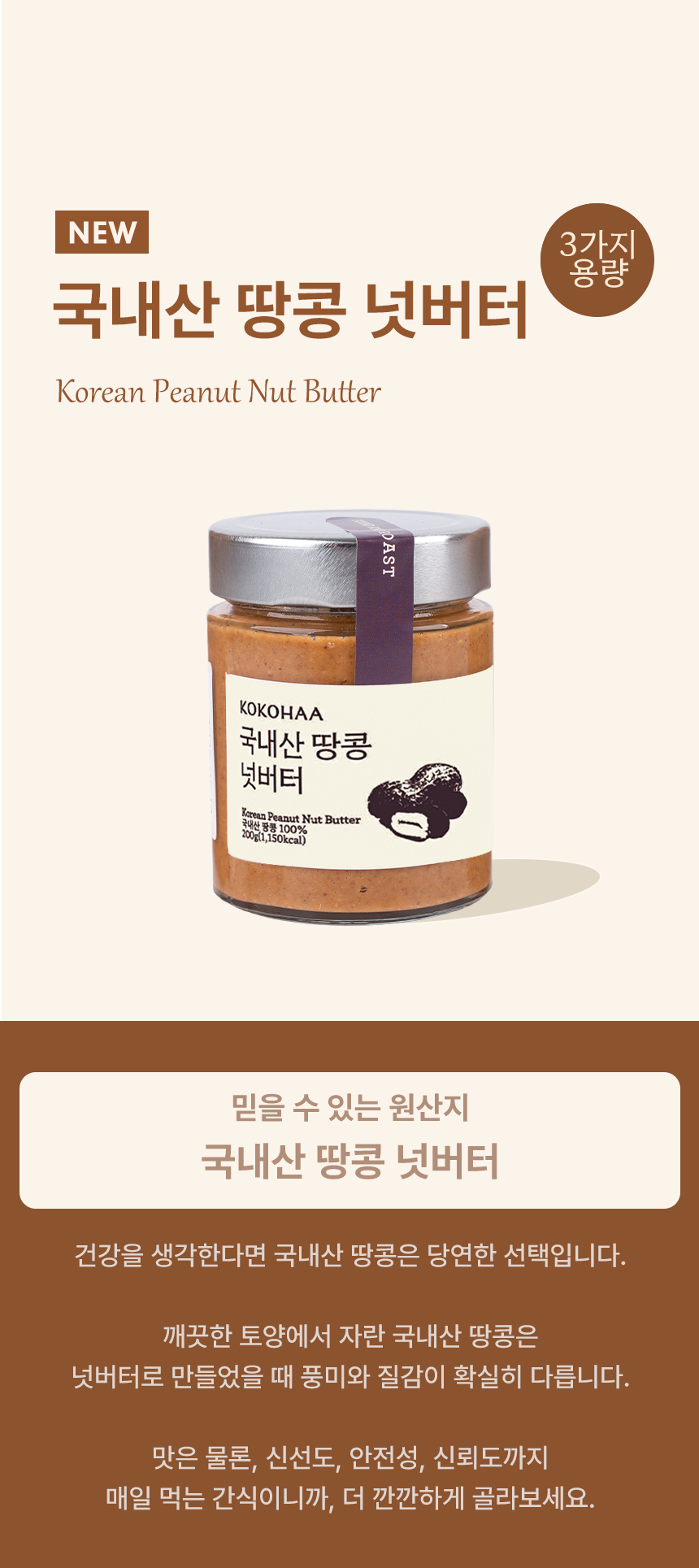 코코하 국내산 땅콩 넛버터입니다. 코코하 국내산 땅콩 넛버터는 최상급 국내산 땅콩을 제주에서 직접 로스팅한 뒤 첨가물 없이 그대로 갈아만들어 신선한 풍미와 다채로운 영양소가 가득합니다.