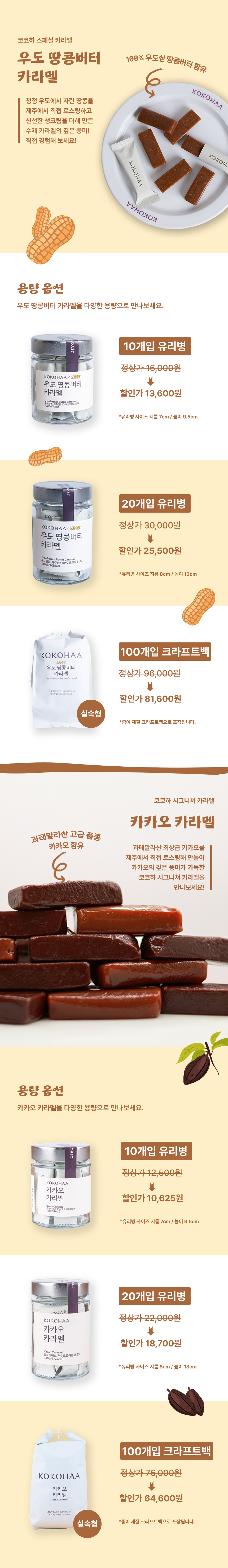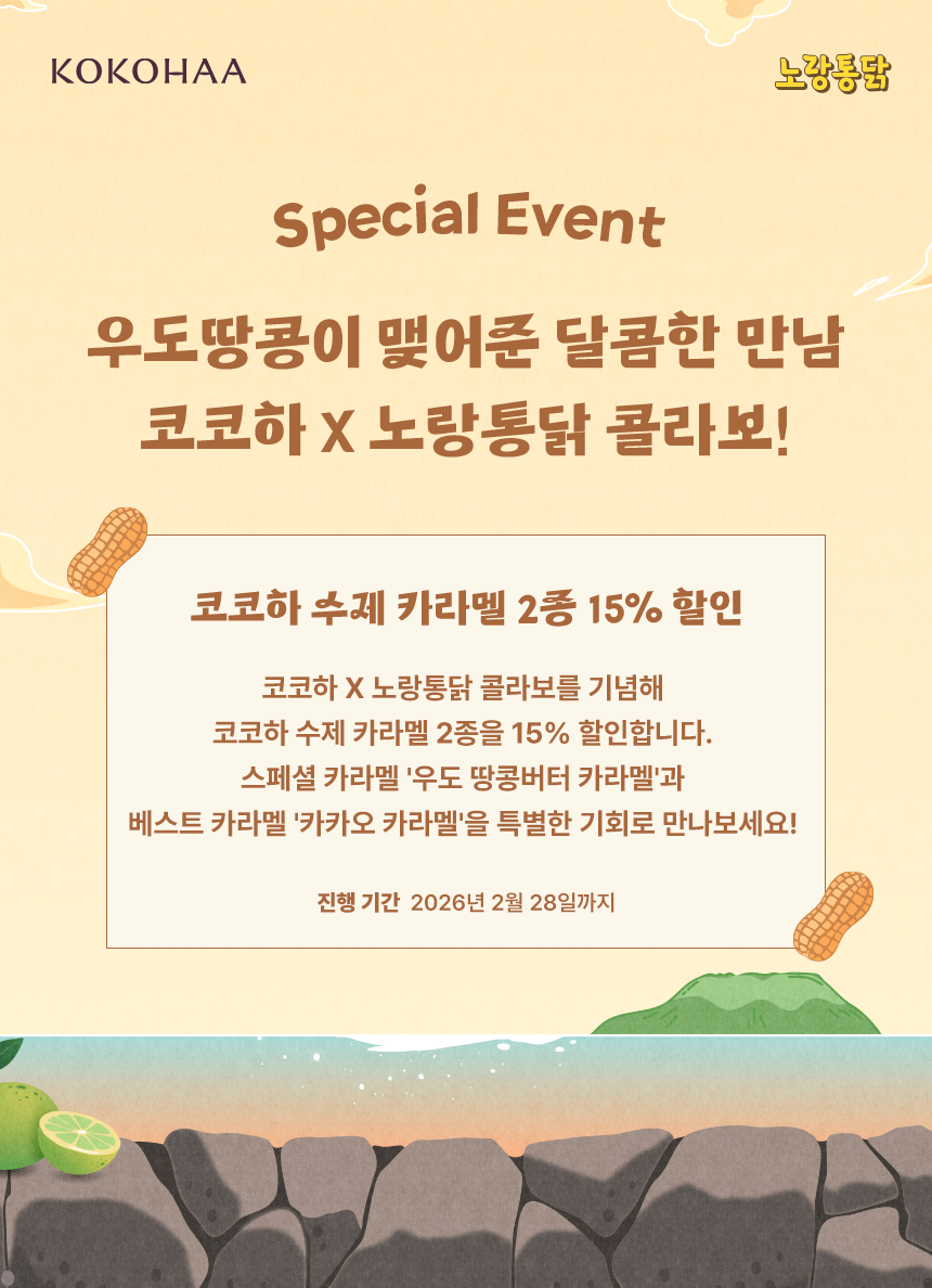 코코하 X 노랑통닭 콜라보를 기념해 코코하의 수제 카라멜 2종을 15% 할인된 특가로 선보입니다. 스페셜 카라멜 '우도 땅콩버터 카라멜'과 코코하의 베스트셀러 카라멜 '카카오 카라멜'을 특별한 기회, 좋은 가격에 만나보세요!