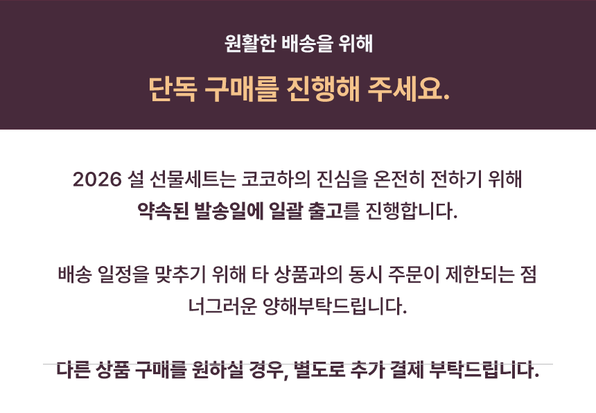 가볍지만 알찬 구성으로, 2026 설을 맞아 새로운 패키지를 출시했습니다. 소중한 분을 위한 선물 완벽합니다.