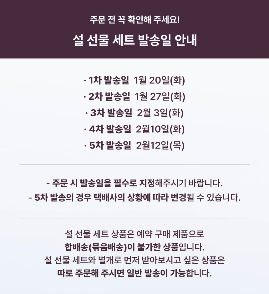 **상품별 출고 일정이 달라 합배송이 어렵습니다. 먼저 받아보시고 싶은 상품은 따로 주문해 주시면 빠른 발송이 가능합니다.