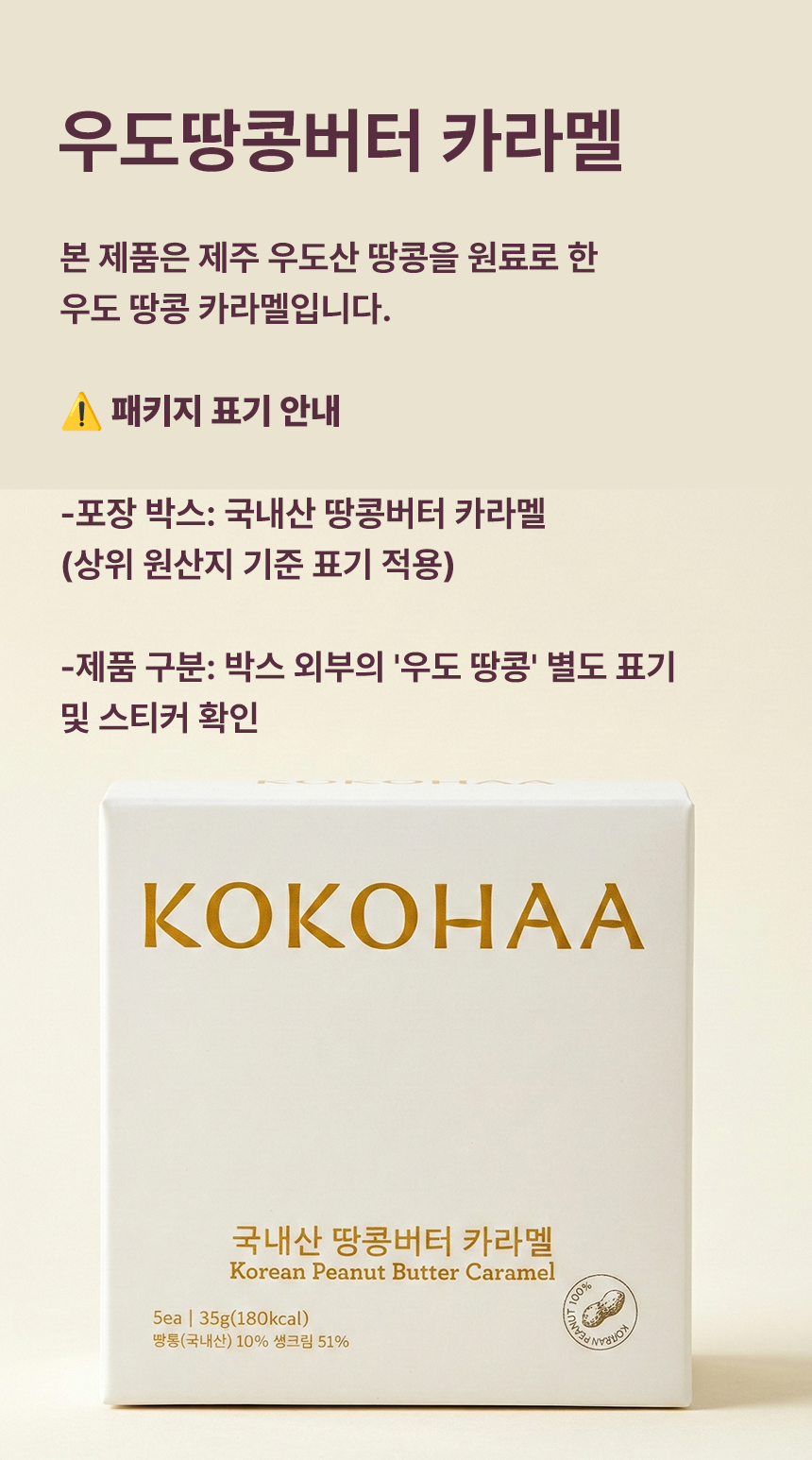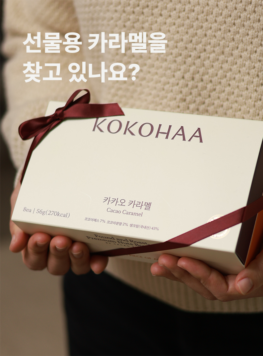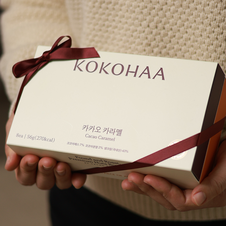 코코하의 카카오 카라멜입니다. 과테말라에서 생산되는 고급 품종의 카카오를 제주에서 직접 로스팅해 맷돌에 48시간 갈아 정성껏 만들어낸 수제 카라멜입니다.